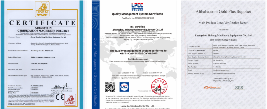 Since 1998, Jinheng Machinery has been dedicated to the design and manufacturing of high-quality concrete mixing plants, covering an area of approximately 80000 square meters and employing 260 workers. Obtained CE, SGS, and ISO certifications successively.