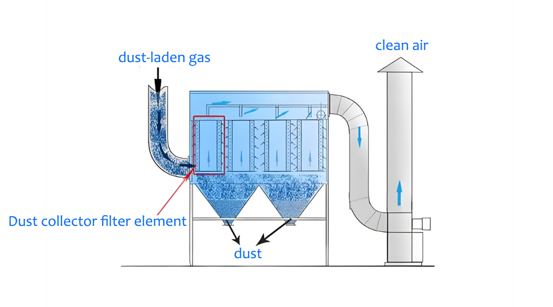 Pulse dust collectors are used for single or multiple point dust removal, as well as in places where dust points are not frequently fixed (such as during welding). Dust containing gas enters the box and is filtered by a flat cloth bag filter. The dust is trapped on the outer surface of the filter bag, and the purified gas enters the fan through the filter bag. It is sucked in by the fan and directly discharged into the indoor environment (or can be connected to the outdoor environment). As the filtration time of the single machine dust collector increases, the dust adhering to the outer surface of the dust removal filter bag also increases, and the resistance of the filter bag also increases accordingly, thereby affecting the dust removal effect. A self-control dust removal mechanism is used for timed vibration and cleaning, or a manual dust removal mechanism is used to automatically vibrate and clean the dust for tens of seconds after stopping, so that the dust adhering to the outer surface of the filter bag is shaken off, and the dust falling into the dust collection container (drawer) is manually pulled out